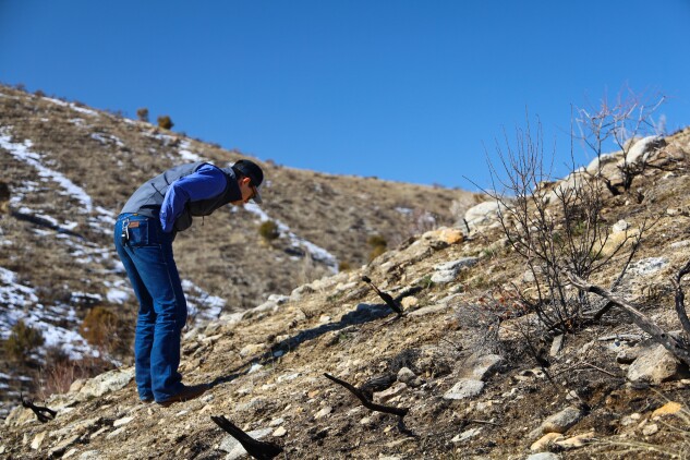 Tanner Beymer, associate director at the National Cattlemen’s Beef Association, examines a wildfire burn scar in a sagebrush and pinyon-juniper forest in northern Nevada in February 2020.