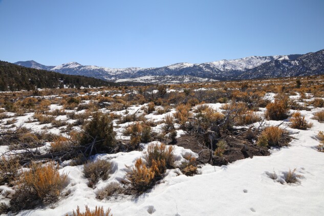 In a broad Eastern Nevada valley, a sagebrush steppe transitions to pinyon-juniper forests in the distance in February 2020.
